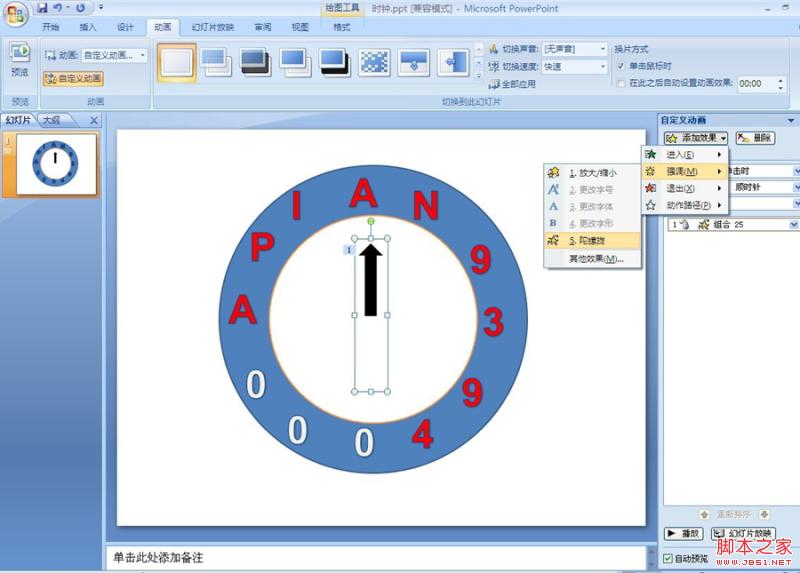6、选中时针,选择“自定义动画”,添加“动作效果”为:强调-->陀螺旋。