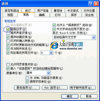 上图中,切换到“常规”选项卡,然后,在“常规选项”的下面,找到“蓝底白字”选项,在其前面打上一个√勾,最后点击“确定”按钮退出即可.