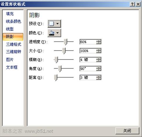 2、添加阴影效果。( 透明度:60%,大小:100%,模糊:4磅,角度:90,距离:3磅)