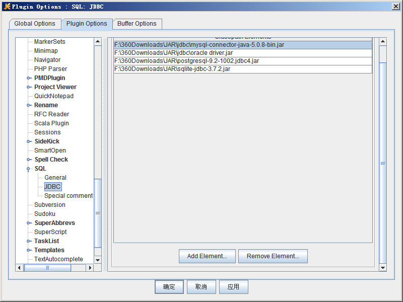 然后再介绍一下jedit当做数据库管理工具的插件SQL,这个要配合projectview使用。先在插件管理器里安装SQL插件和projectview插件,然后在插件菜单的插件设置中SQL->JDBC,添加JDBC驱动的jar包,我这里是mysql的connect包,可以去官网下载:http://www.cr173.com/soft/45333.html
