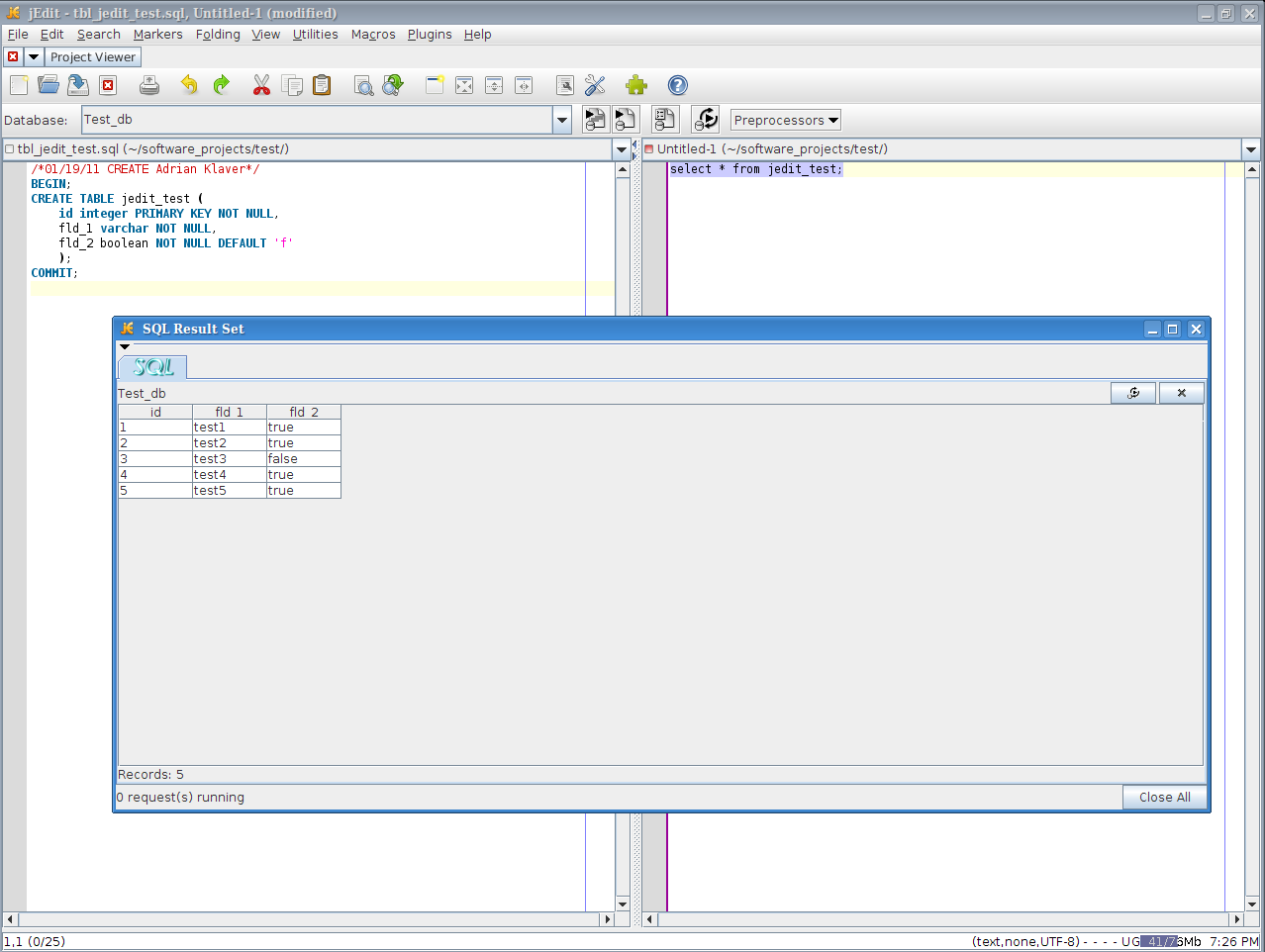 打开SQL插件的Toggle Toolbar,SQL工具栏就出现了,在Datebase下拉菜单中选择你刚刚新建的SQL server,新建文件,写一句SELECT语句测试一下,选中写好的SQL语句,点击下拉菜单后的第一个按钮Execution Selection。然后如图。