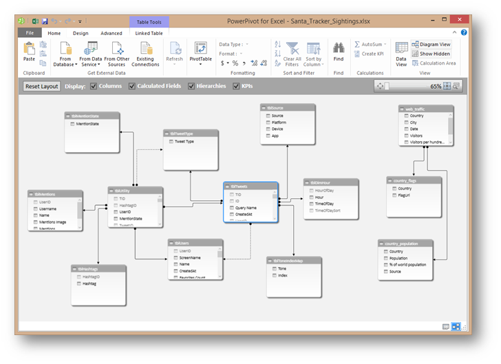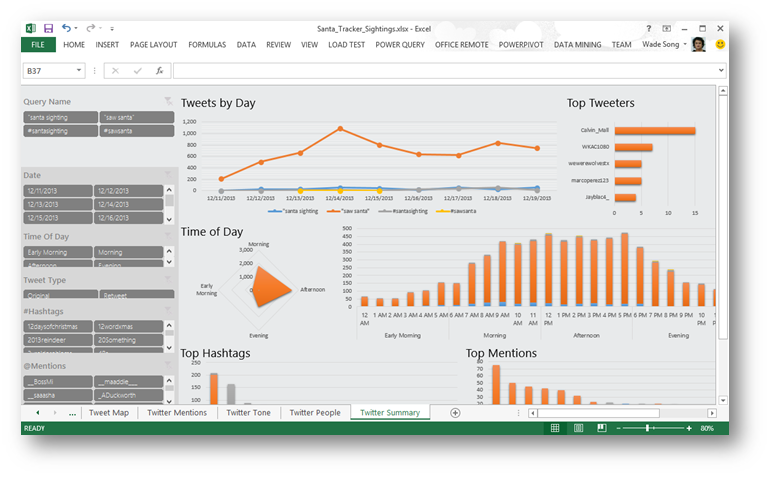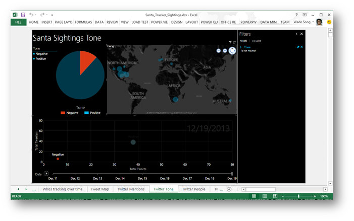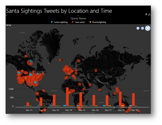 要回答这个问题,来自社交网络的数据是最合适不过的了。于是Power BI团队用以下关键字在推特上做了一些搜索:"santa sighting", "saw santa"以及"#santasighting",把这些搜索结果数据导入到Excel之后,创建Power Pivot模型,然后在Power View中的可视化效果来浏览推特中的数据,以及,这些数据都是来自于哪里。