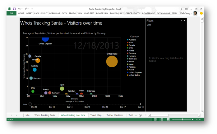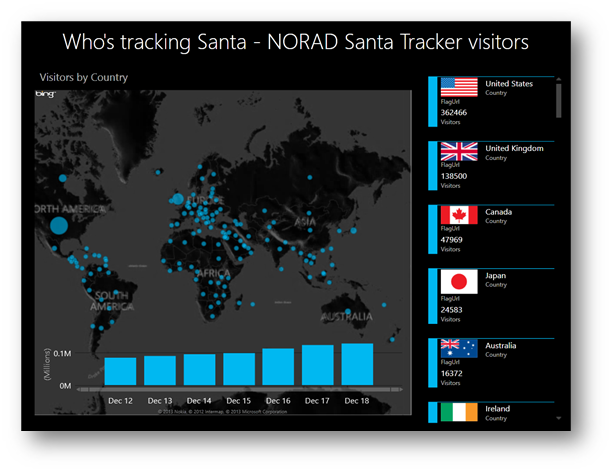 除此之外,Power BI团队通过NORAD Santa Tracker网站的数据,在圣诞节前对全球范围内的访问者进行统计。首先通过Power Query的在线搜索,统计来自全球的站点访问,导入到Excel中,然后创建数据模型,并且通过Power View的可视化功能显示最近7天的访问情况。