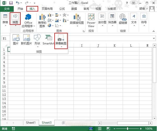 ①启动Excel2013,单击菜单栏--插入--插图--屏幕截图。