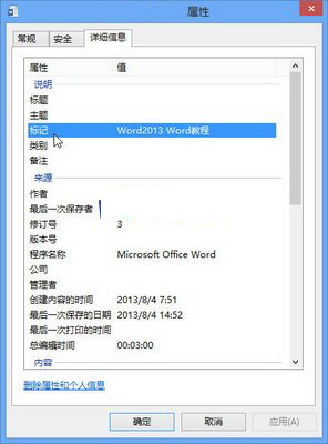 Word Home提示:如果在Windows8系统的计算机窗口中通过右键命令查看上述添加了关键词的Word文档属性,则“标记”选项即为关键词,如图2013080414所示。