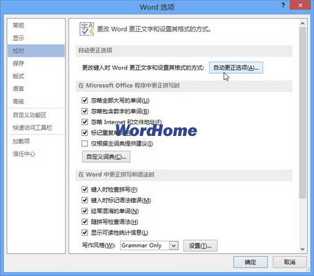 第2步,在打开的“Word选项”对话框中切换到“校对”选项卡,在“自动更正选项”区域单击“自动更正选项”按钮,如图2013102902所示。