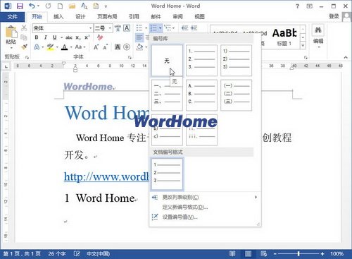 第4步,返回Word2013文档窗口,在文档中输入任意数字(例如输入阿拉伯数字1),然后按下Tab键。接着输入具体的文本内容,按下回车键自动生成编号。连续按下两次回车键将取消编号状态,或者在“开始”功能区的“段落”分组中单击“编号”下拉三角按钮,在打开的编号列表中选择“无”选项取消自动编号状态,如图2013102904所示。
