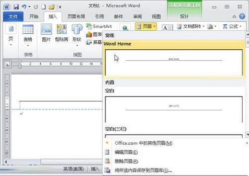 Word2010中的库主要集中在“插入”功能区,用户也可将自定义的设置添加到特定的库中,以便减少重复操作。下面以在页眉库中添加自定义页眉为例,操作步骤如下所述:
