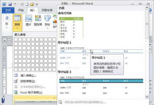 所谓“库”就是一些预先格式化的内容集合,例如“页眉库”、“页脚库”、“表格库”等等。在Word2010文档窗口中,用户通过使用这些具有特定格式的库可以快速完成一些版式或内容方面的设置。例如单击“插入”功能区的“表格”按钮,可以从“快速表格库”中选择已经预格式化的表格,如图2009121501所示。