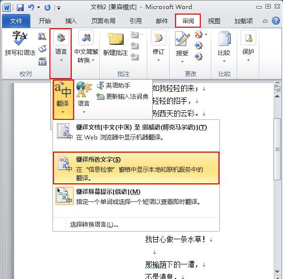 2、在功能区点击“审阅”选项卡,选择“语言”区域的“翻译”选项组,单击“翻译所选文字”;