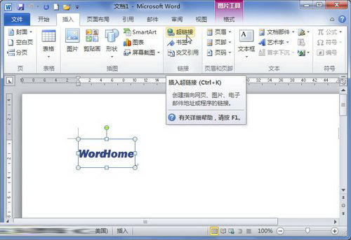 第1步,打开Word2010文档窗口,单击选中需要创建超链接的图片。切换到“插入”功能区,在“链接”分组中单击“超链接”按钮,如图1所示。