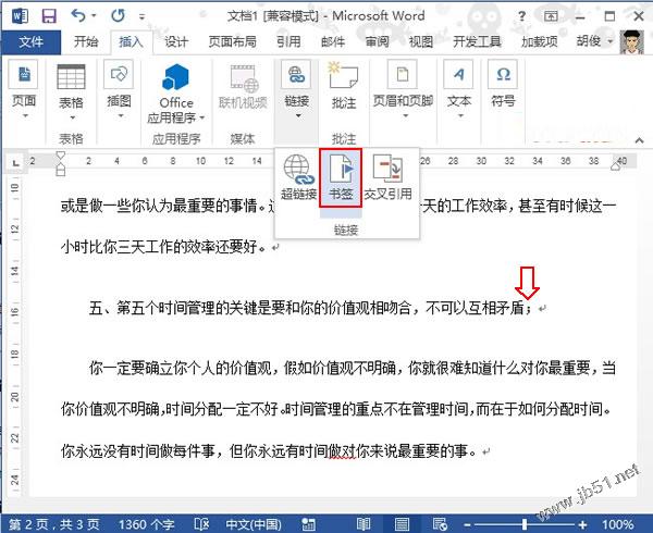 ①先来教大家插入书签,首先,我们打开一份Word文档,光标定位到需要插入书签的位置,例如第5条后,单击菜单栏--插入--链接--书签。