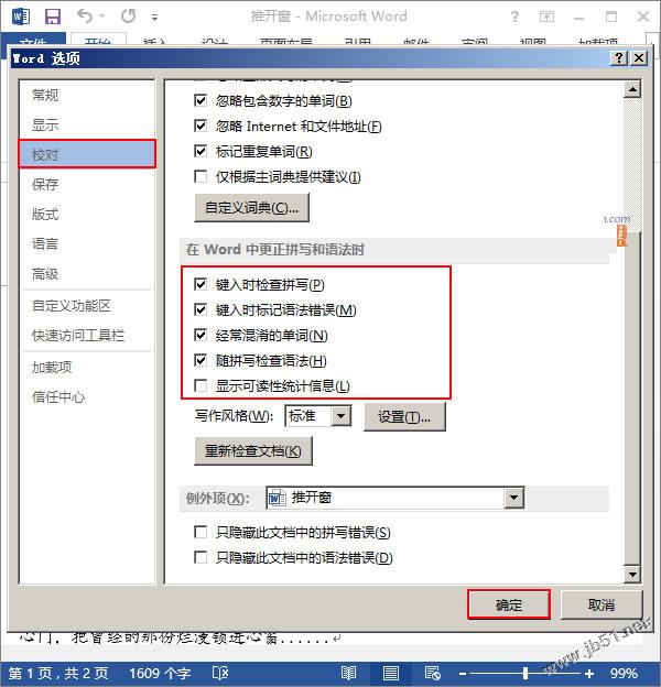 提示:大家可以根据自己的需要设置“校对”中的“例外项”,从而达到隐藏文档中的拼写错误或者语法错误的效果。