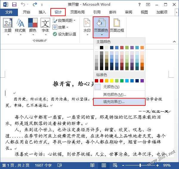 1、用word2013打开一篇文档,并切换到“设计”选项卡,然后单击“页面颜色”的“填充效果”按钮。