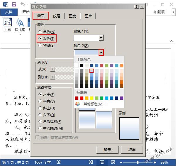 2、此时会弹出一个“填充效果”对话框,我们切换到“渐变”选项卡,在“颜色”区域中单击“双色”单选按钮,并在其右侧选择我们喜欢的颜色搭配。例如,我们现在切换到“渐变”选项卡,单击“颜色2”下拉框右侧的下拉按钮,在“主题颜色”中选择“深蓝,文字2,淡色80%”。