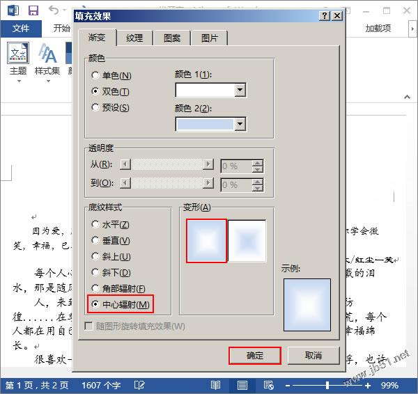 3、现在,我们可以在“底纹样式”和“变形”中选择我们喜欢的样式形状了,最后单击“确定”按钮即可。例如,我们现在选择“中心辐射”以及第一种形变,然后单击“确定”按钮。