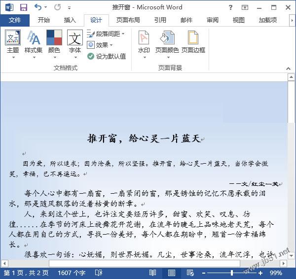 你想让你的文档每天看起来都有那么点儿不一样,随你的心情变化吗?我可以偷偷告诉你个方法哦,设置你文档的页面背景吧。说实话,这个方法不仅简单而且很实用的。不信的话我们就一起来看看如何在word2013中为文档设置页面背景吧。