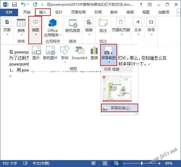 2、用Word2013打开一篇文档,将光标定位在我们需要插入截图的地方,并切换到“插入”选项卡,单击“插图”选项组下的“屏幕截图”命令,在随后展开的菜单中选择“屏幕剪辑”选项。
