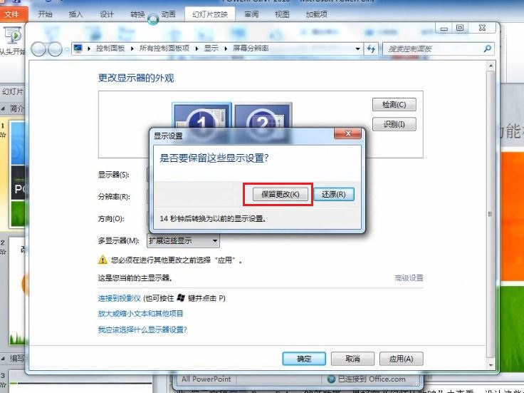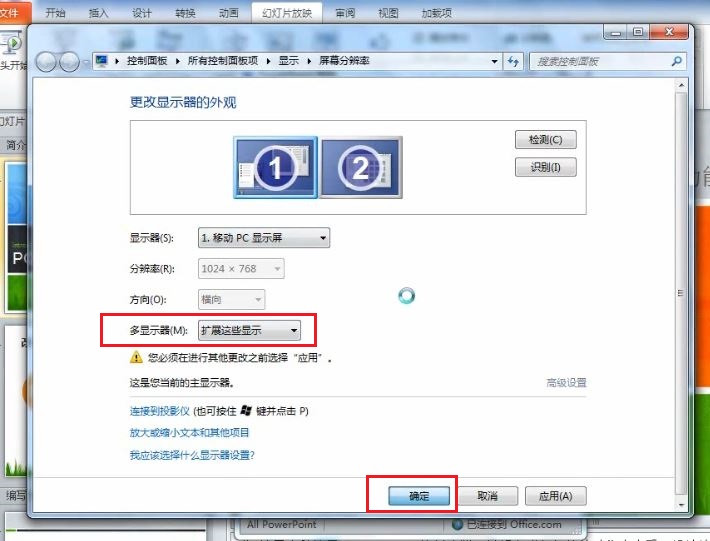 3. 目前已经将计算机连接好了投影仪,可以看到已经出现了两个监视器,在“显示器选择”中选择“扩展这些显示”,然后单击“确定”按钮;