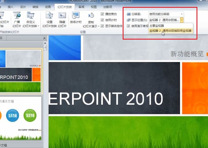 1. 打开 powerpoint 2010,点击“幻灯片放映”选项卡,在“监视器”选项组中有一个“使用演示者视图”选项,该选项的作用就是将全屏的幻灯片投射到大屏幕上,而我的计算机不仅能看到幻灯片还能看到备注和计时的信息;