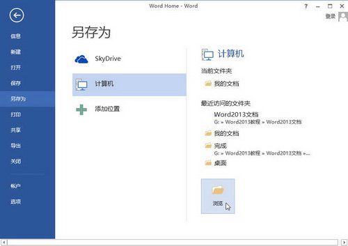 第1步,打开Word2013文档窗口,依次单击“文件”→“另存为”按钮。在“另存为”选项卡中选择“计算机”选项,并单击“浏览”按钮,如图2013080406所示。