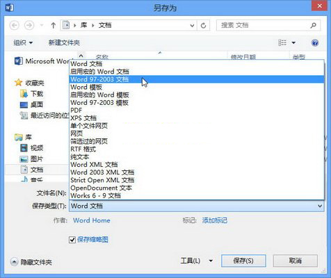 第2步,在打开的“另存为”对话框中,单击“保存类型”下拉三角按钮,在文件类型列表中选择“Word97-2003文档”选项。然后选择保存位置并输入文件名,最后单击“保存”按钮即可,如图2013080407所示。