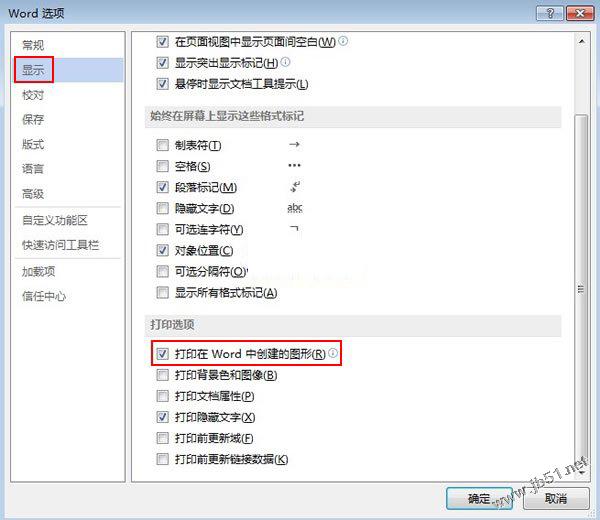 ④切换到显示标签,拉动滚动条,在显示里面勾选打印在Word中创建的图形。