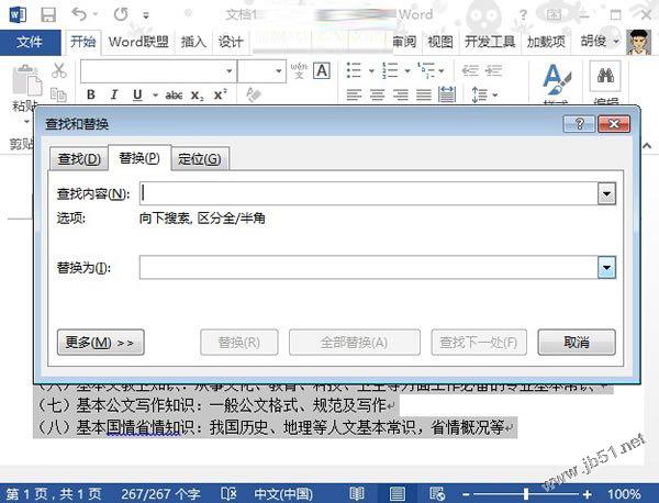 ①我们启动Word2013,打开文档,发现末尾处都没有句号。按下键盘上的Ctrl+H,打开替换对话框。