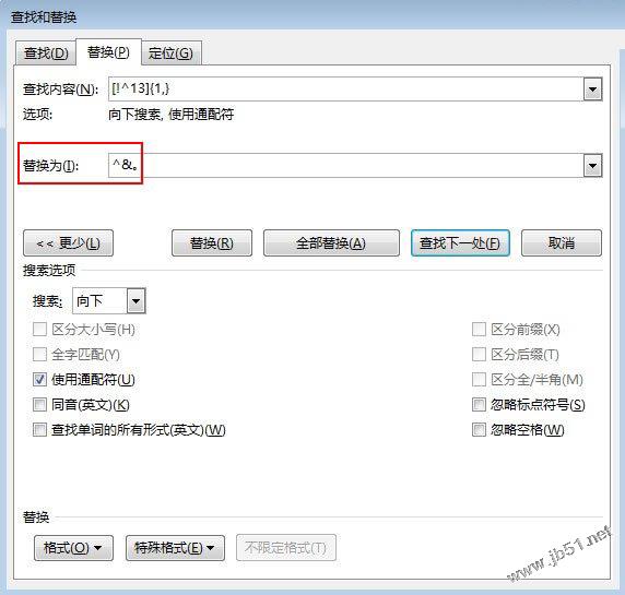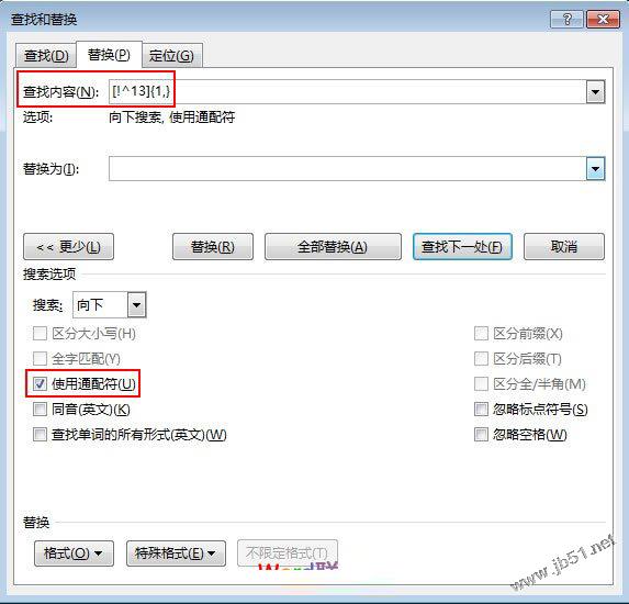 ②单击更多按钮之后,勾选使用通配符。在查找内容中输入: [!^13]{1,}