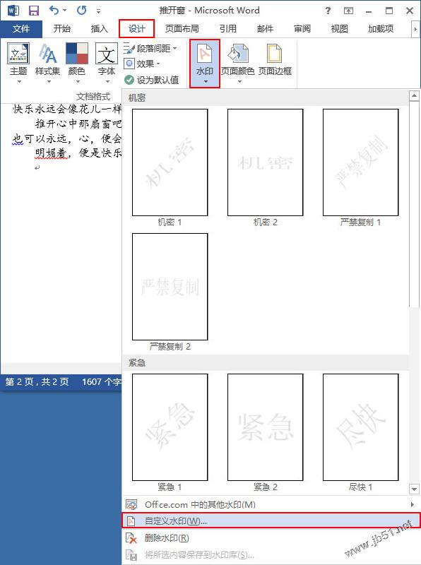 1、 用Word2013打开一篇文档,切换到“设计”选项卡,然后我们选择“水印”选项组下的“自定义水印”选项。