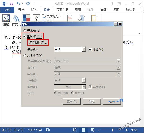 2、此时会弹出一个“水印”对话框,我们选择“图片水印”,然后单击它下面的“选择图片”按钮。