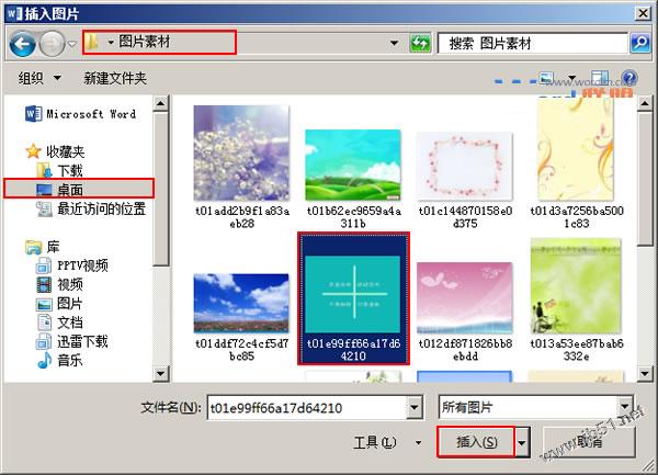 4、我们可以在接下来弹出的“插入图片”对话框中选择自己喜欢的图片,并单击“插入”按钮。例如,我们选择“桌面”中“图片素材”文件夹里的名为“t01e99ff66a17d64210”的文件,然后单击“插入”按钮。