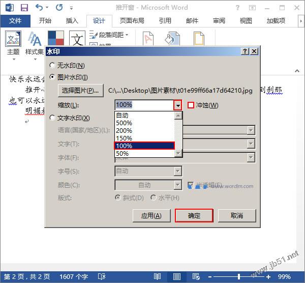 5、此时系统会自动返回“水印”对话框,大家可以根据自己的喜好选择是否冲蚀以及缩放图片。例如:我们现在单击“缩放”下拉框右侧的下拉按钮,选择“100%”选项,并取消对“冲蚀”复选框的选择,最后单击“确定”按钮。