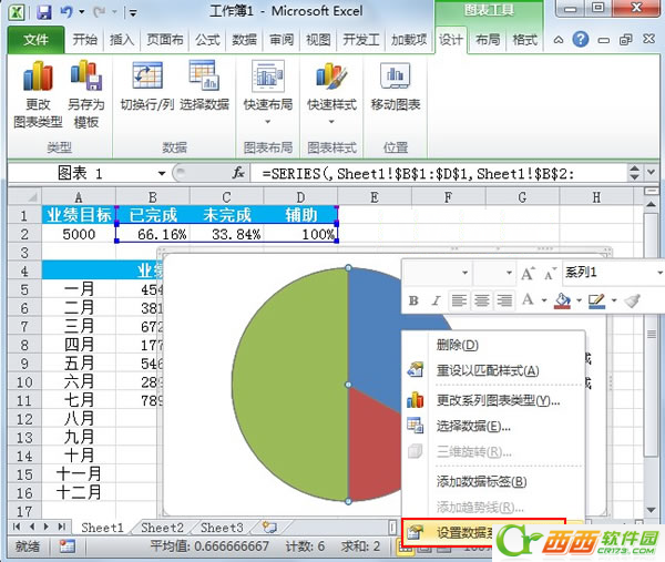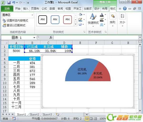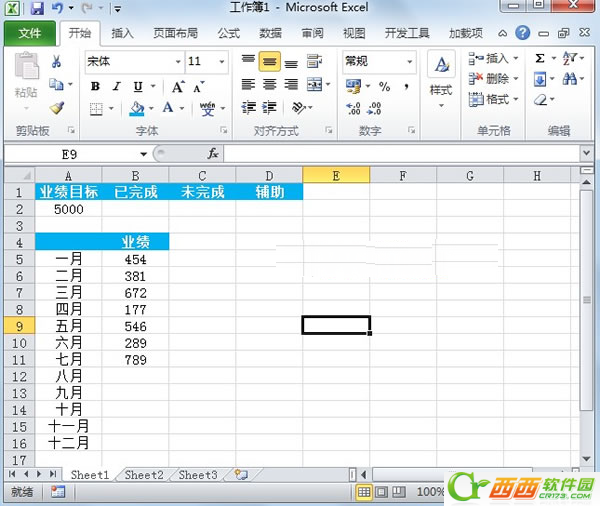 1.创建图表,必须要有数据,我们先启动Excel2010,简单的输入一些数据,包括业绩目标,未完成和完成的百分比,各个月份的业绩情况。