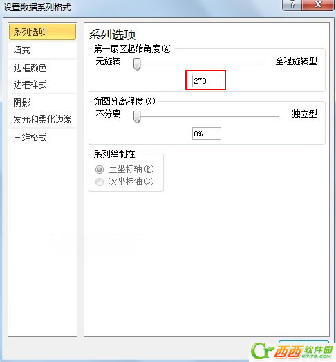 6.弹出设置数据系列格式对话框,在系列选项标签中,将第一扇区起始角度设置为270.