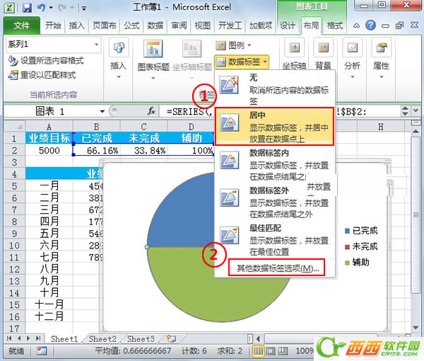 7.选中图表,单击菜单栏--布局--数据标签,先将其设置为居中,然后重复操作,点击最下面的其他数据标签选项。