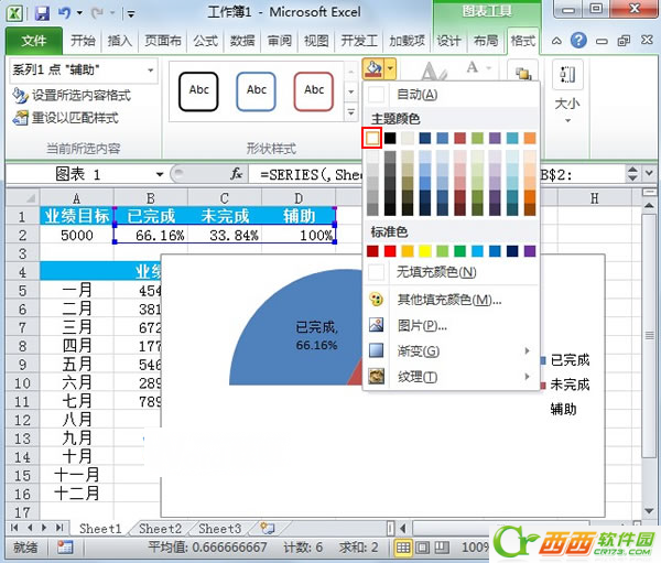9.此时图表各个区域已经含有百分比的数据标签,对于辅助列产生的区域,此时已经无意义,我们先删除上面的标签,按下Delete键,删除标签,然后选中此区域,单击菜单栏--格式--颜色填充,将颜色设置为与底色一样的颜色,这里是白色。