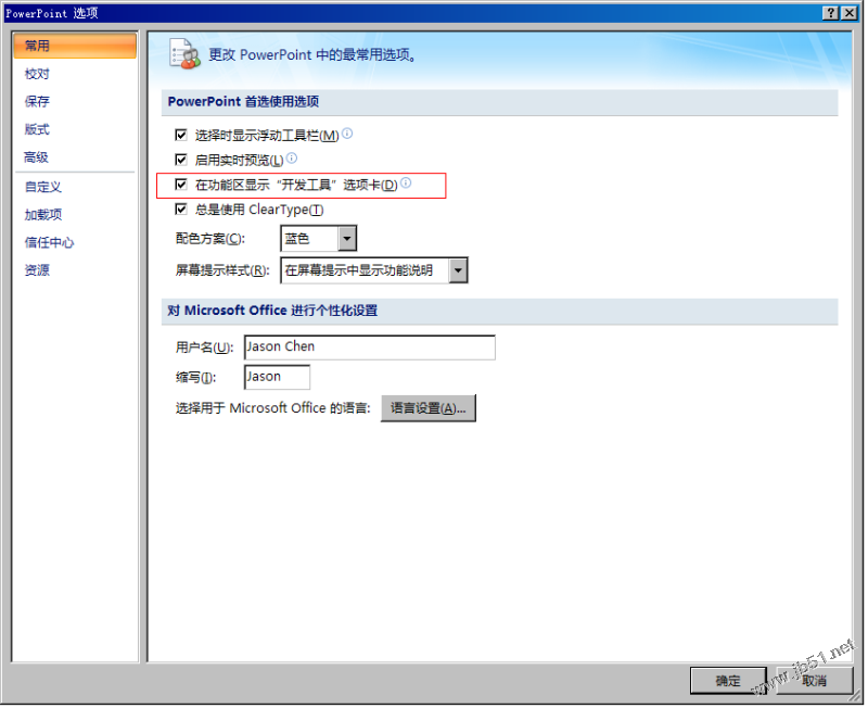 1、Office按钮 >> PowerPoint 选项 >> 常用 >> 勾选“在功能区显示‘开发工具’选项卡”