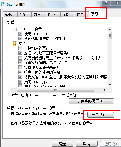 3. 点击高级选项卡,点击重置,勾选删除个性化设置,点击重置。
