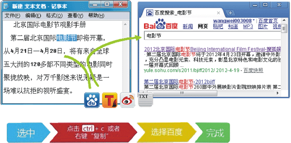 总之,不管你要搜索什么、来自哪里,有copyto,你要做的就只是选中、在弹出框中点一次“百度“。