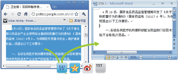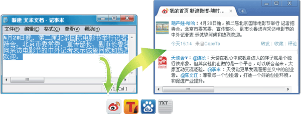 不管您是在哪里看到的精彩内容,只要把它复制下来,在弹出框中点一次微博按钮,瞧,已经发布成功了。是不是很方便呢!