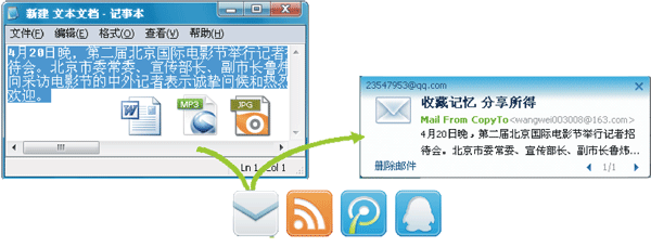 接下来不论是音乐、文档、图片或者你记事本中的一段文字,不论存储在什么位置,只要在点击复制时,在弹出的浮框中点击邮件图标,即可一键发送。