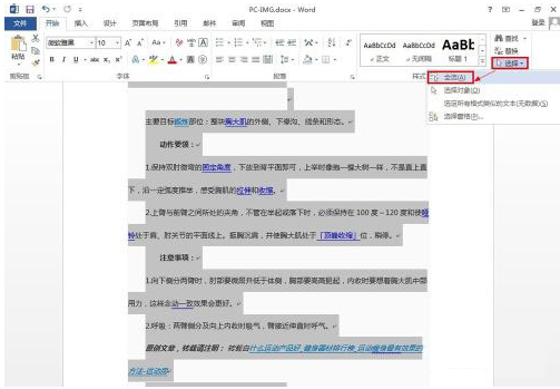 1、点击【选择】---【全选】,或按键盘的「Ctrl+A」,选取整篇文章。