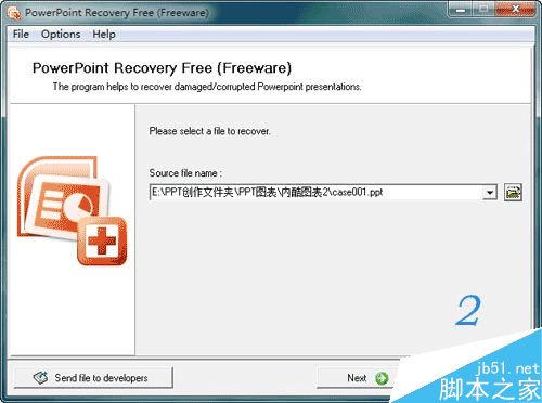 2、点选右边的文件夹图标,找到损坏的ppt文件,现在这个PPT恢复软件也已经支持修复2010版本的PPT文档,所以pptx格式的文件也可以支持。如下图。