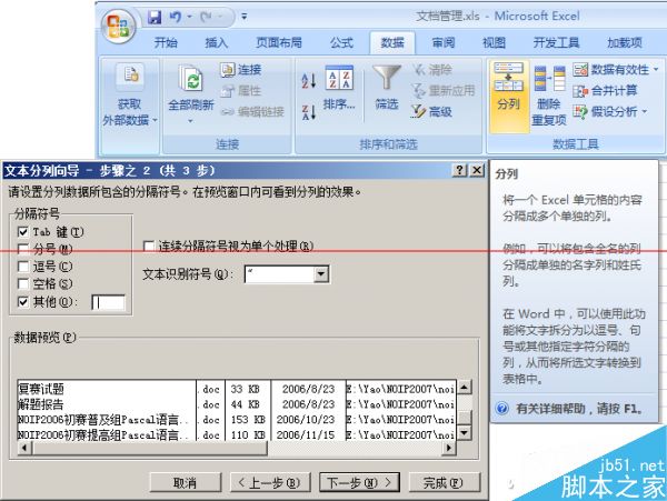 在PrintFolder软件右侧的搜索结果框中,右击打开快捷菜单,依次执行“全选”和“复制”命令,复制上述搜索结果;然后打开Excel2007,将其全部粘贴到一个新工作表当中,然后选定该列数据,执行“数据-分列”命令,通过“文本分列向导”,选择文本分隔符号为“|”,将各个文档属性值分列显示(图3)。