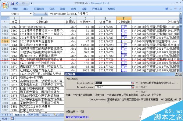 根据表格内容,设置好对应的Excel表头。如果想让文档目录检索更为方便一些,可以选定整个数据区域,将文档按指定属性值进行排序,这里以文件类型为主要关键字,以创建日期为次要关键字进行排序。在F列中插入HYPERLINK函数,该函数的作用是“创建一个快捷方式或链接,以便打开一个存储在本地硬盘、局域网服务器或Internet上的文档”,Link_location参数表示文件路径,这里对应G列中的内容,Friendly_name参数表示超链接的名称,这里设置为“打开”,将该函数复制应用到整列单元格,即可完成文档链接的创建操作(图4)。