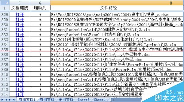 在使用文档链接表查看使用各种文档的过程中,难免会发现一些重复出现或者早已无用的文档,逐个打开各个文件夹,当然可以进行删除操作,但是手工操作的效率实在不敢恭维。其实,我们也可以借助上述文档目录,先在文件路径前面添加一个辅助列,将需要批量删除的文档设置一个相同的符号,例如*;然后再以“辅助列”为主关键字进行排序,就可以立即筛选出分布在不同文件中的需要删除的文档(图5)。