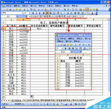 “=VLOOKUP(用户映射表!A3,ERP账号表!$A$3:$B$11,2,0)”,意思即为, 在“ERP账号表”的A3至B11区域中,查找“用户映射表”的A3格数据,如匹配,则将“ERP账号表”中的第二列(即B列)的数据,拷贝至B3表格中。由于在公式中的“用户映射表!A3”采用相对值,所以,选中B3列,向下拉动鼠标在数据区拖拉填充公式即可。
