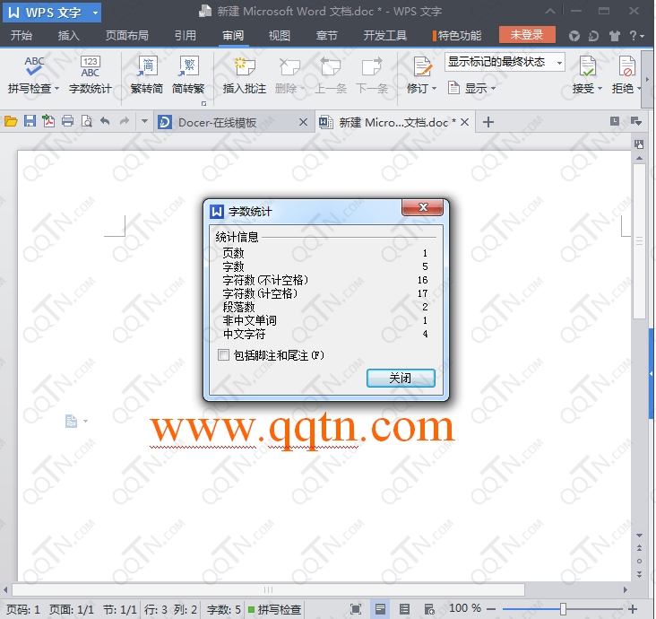 单击WPS“审阅”选项卡,在“校队”选项组中第二个就是“字数统计”