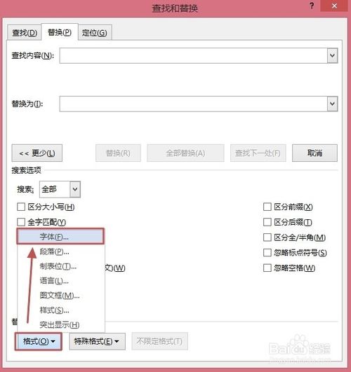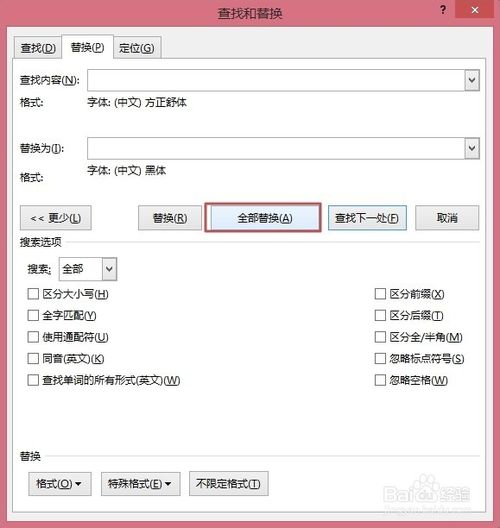 6、返回到“查找和替换”对话框,将光标定位到“替换为”右侧的文本框中。使用上述同样的办法选择字体。